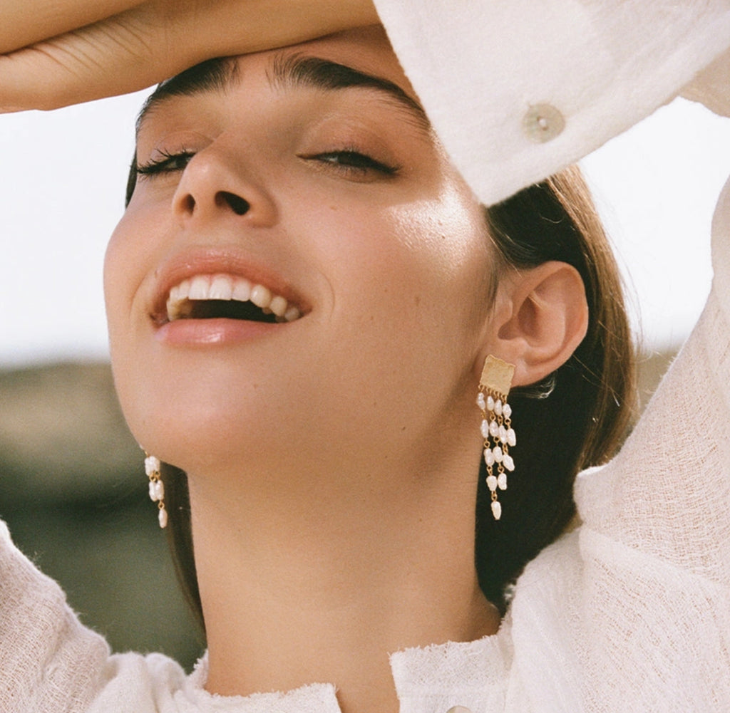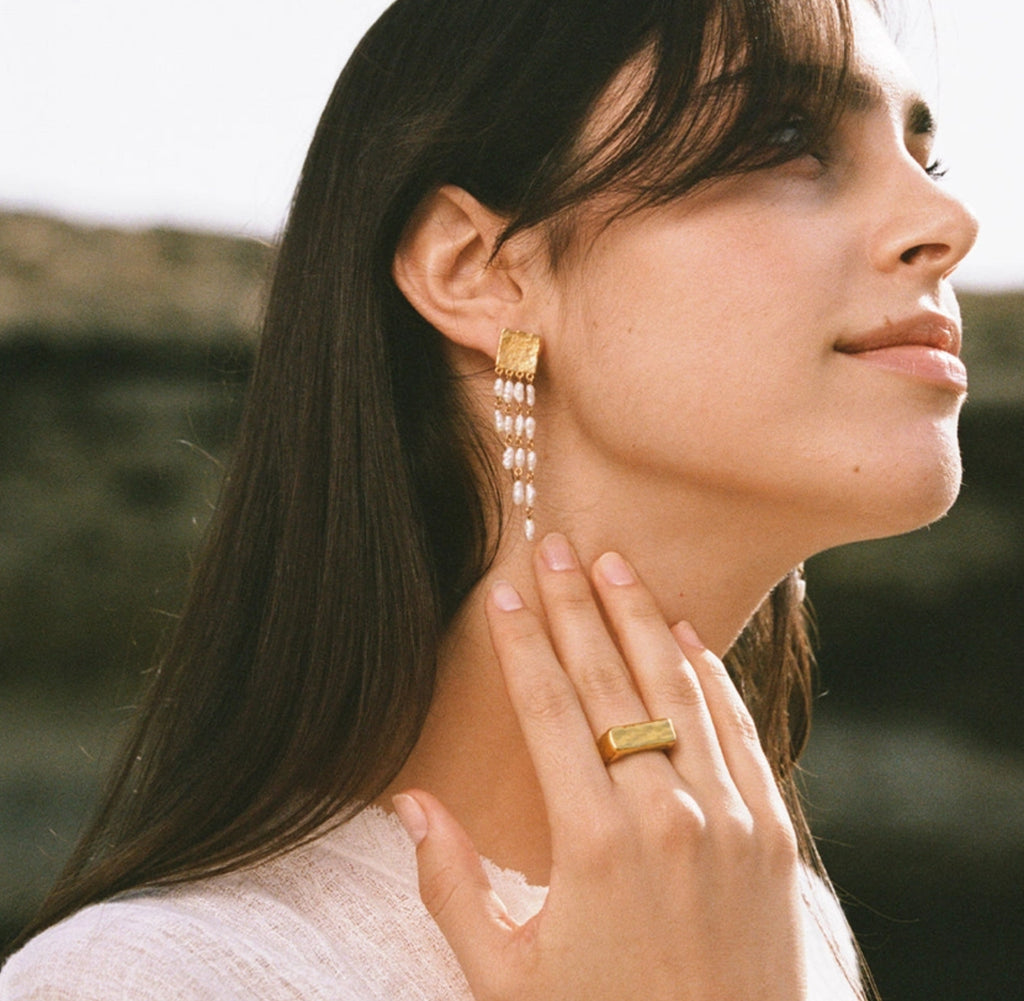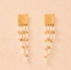Bold and daring, our Sappho drop earrings feature cascading tiers of delicate freshwater rice pearls, dangling from a hammered gold square post. A feminine statement of texture and movement.