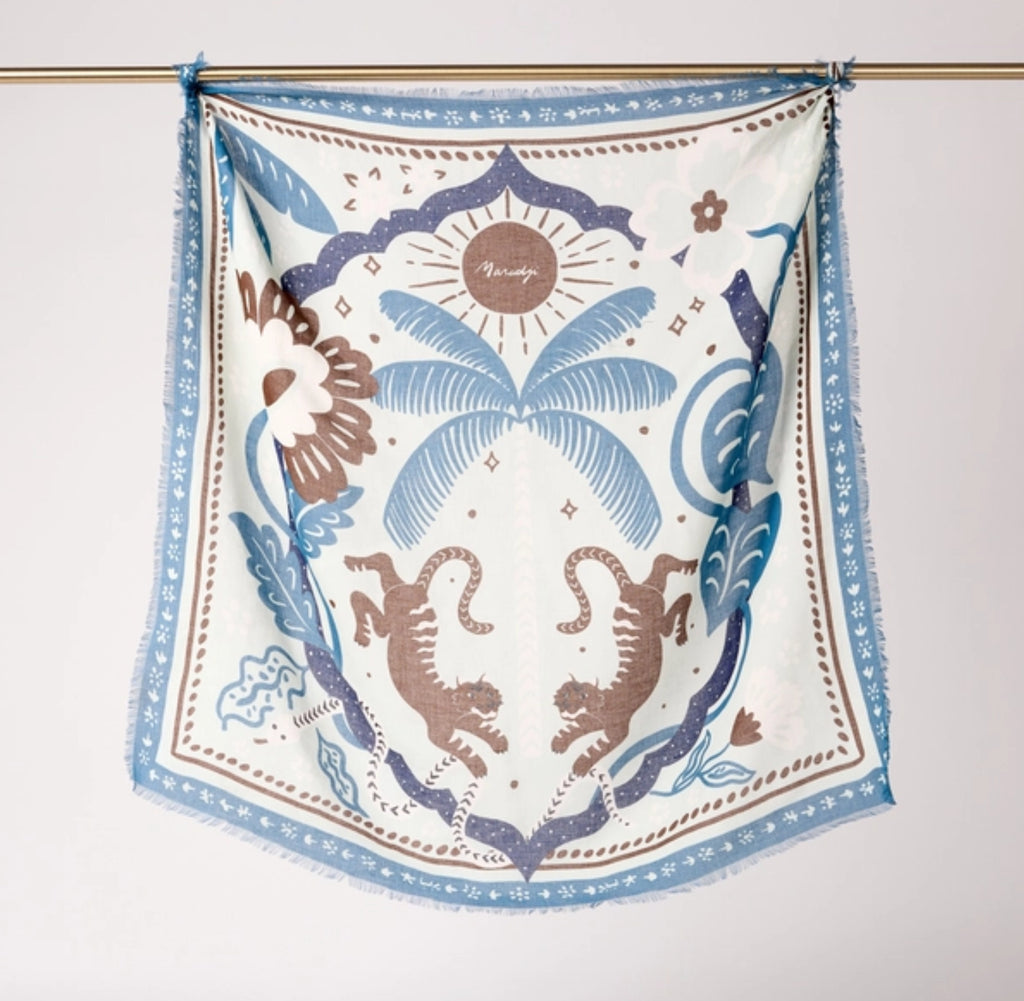 Square scarf in wool, cotton, and modal, printed with an exclusive graphic and botanical pattern, in which a stylized tiger is hidden. This premium piece perfectly combines narrative exoticism with contemporary aesthetics. The noble blend of natural materials offers a fluid, warm, and soft drape, ideal for cold seasons. Its artisanal printing in India and its finish demonstrate true textile craftsmanship. 100cm x 100cm